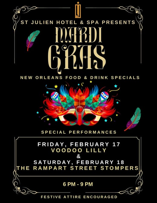Celebrate Mardi Gras with costumes, live music from Voodoo Lilly and The Rampart Street Stompers, food and drink specials, and more! Fri. & Sat., Feb. 17 & 18, 6 to 9 pm at the St. Julien Hotel & Spa.