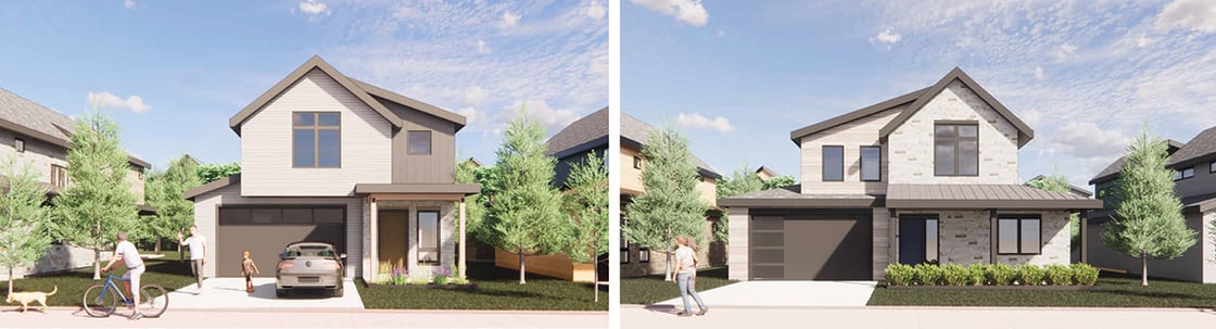 and 4,339 sf Larkspur Plan (right) and feature up to six bedrooms and six bathrooms, home offices, flex spaces, finished basements, generous outdoor living areas and